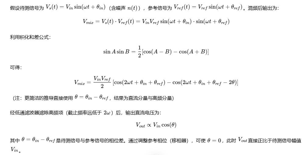 混频器(乘法器):将输入信号与参考信号相乘,将信号频率搬移到直流及高频分量(通过三角函数积化和差公式)。